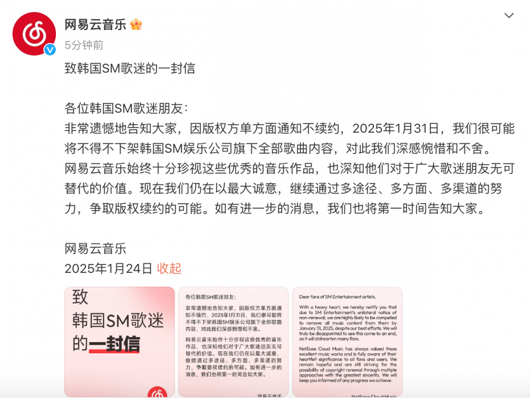 今宇宙午,网易云音乐官微发文称,因版权方片面见知不续约,网易云音乐很可能不得不于1月31日下架韩国SM文娱公司旗下一王人歌曲实验。