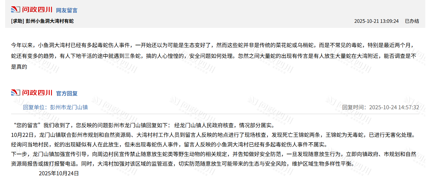 有东谈主在问政四川平台上发帖称彭州市小鱼洞大湾村疑似出现多起毒蛇伤东谈主事件
